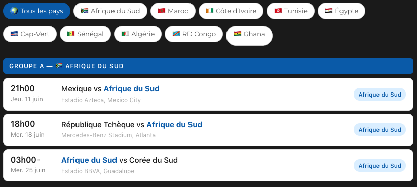 Pour la première fois, dix sélections africaines vont participer à la Coupe du monde en 2026. Découvrez dans cet article le calendrier du Mondial de l’Afrique du Sud, l’Algérie, la Côte d’Ivoire, le Cap-Vert, l’Egypte, le Ghana, le Maroc, la Tunisie, le Sénégal et la RD Congo.